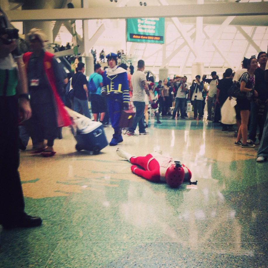Got to the line and it took us… like 2+ hours waiting in the REALLY hot California sun just to get our badges… it was awful in our blazers and wigs… I swear all my makeup melted off. We finally got into the con center and kind of died on the steps in this one area by the food court….