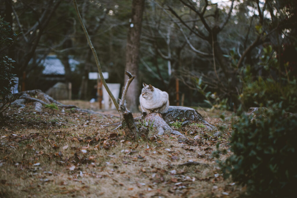 On our way out of the park, we noticed this beautiful cat perched on a tree stump. Like a magical encounter, we quietly and calmly followed it to a rest area with a few stone benches.