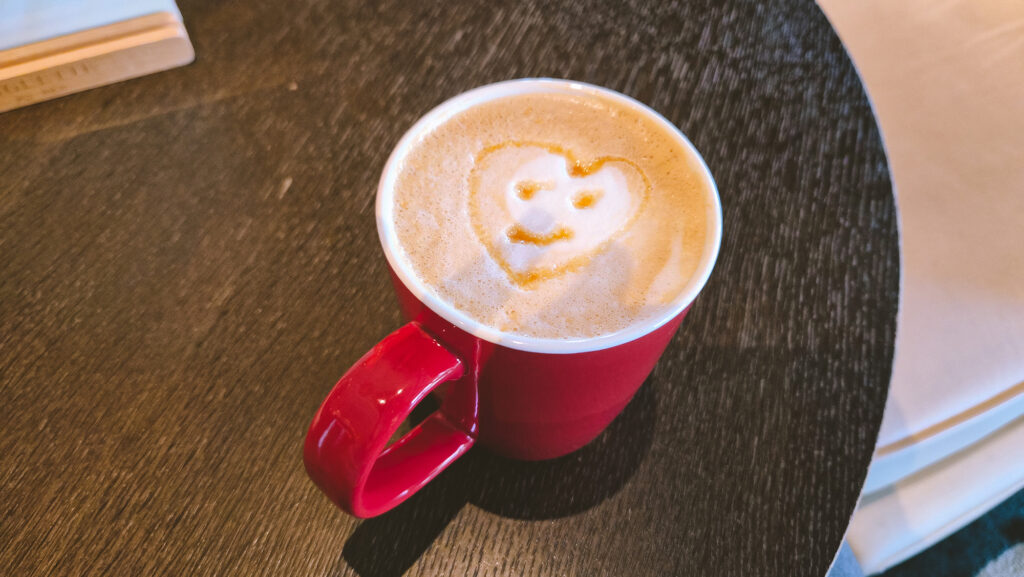 After breakfast, we waited for room to be available in the lobby cafe. The barista drew a cute heart-shaped face on my latte…!!